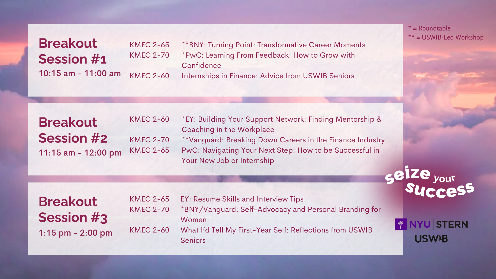 Roundtables: discussions where participants and 2-4 professionals sit around a table for an open exchange of ideas and perspectives on a specific topic